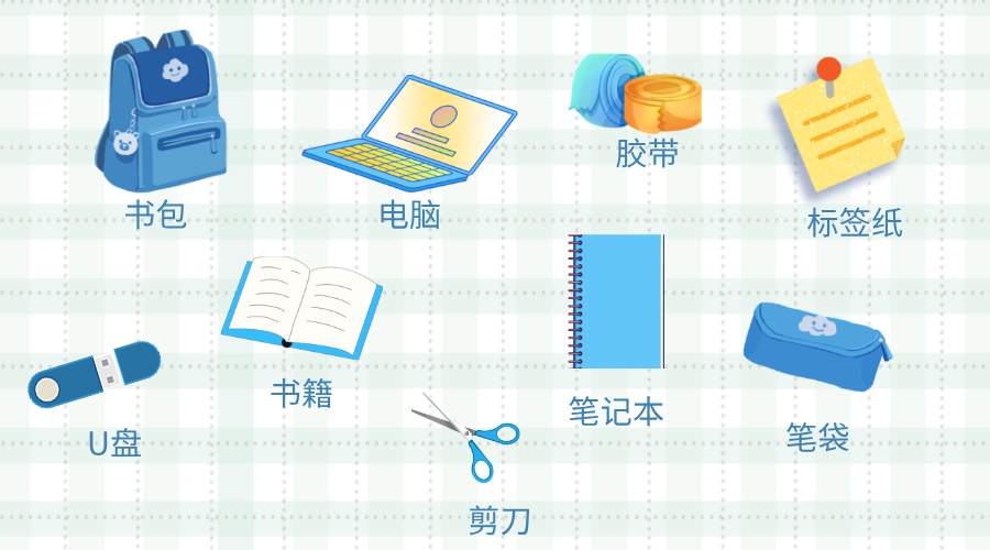 1. 书包、笔记本、笔、橡皮、水彩笔(用来上课划重点的)、笔筒(袋)
