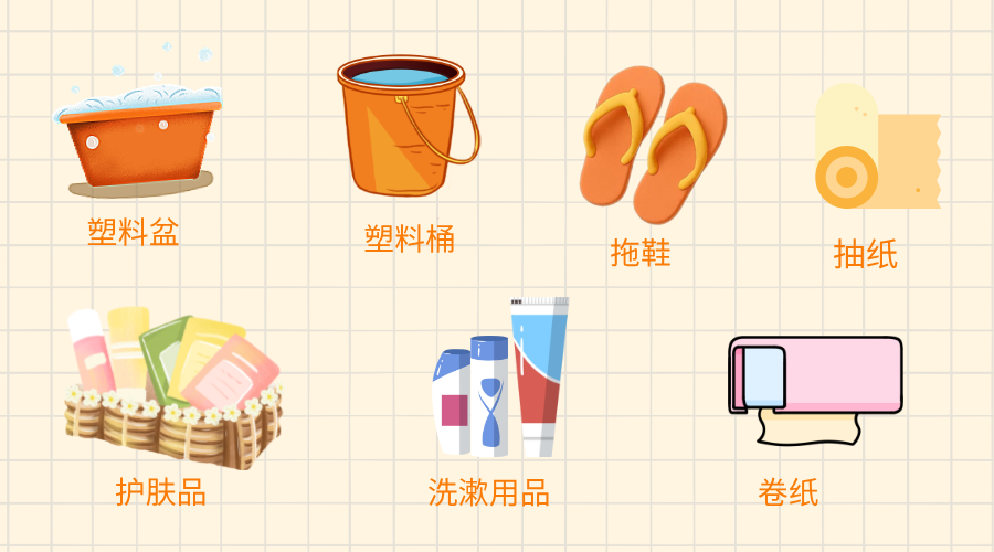 1.洗漱用品:牙膏、牙刷、漱口杯、毛巾、桶盆