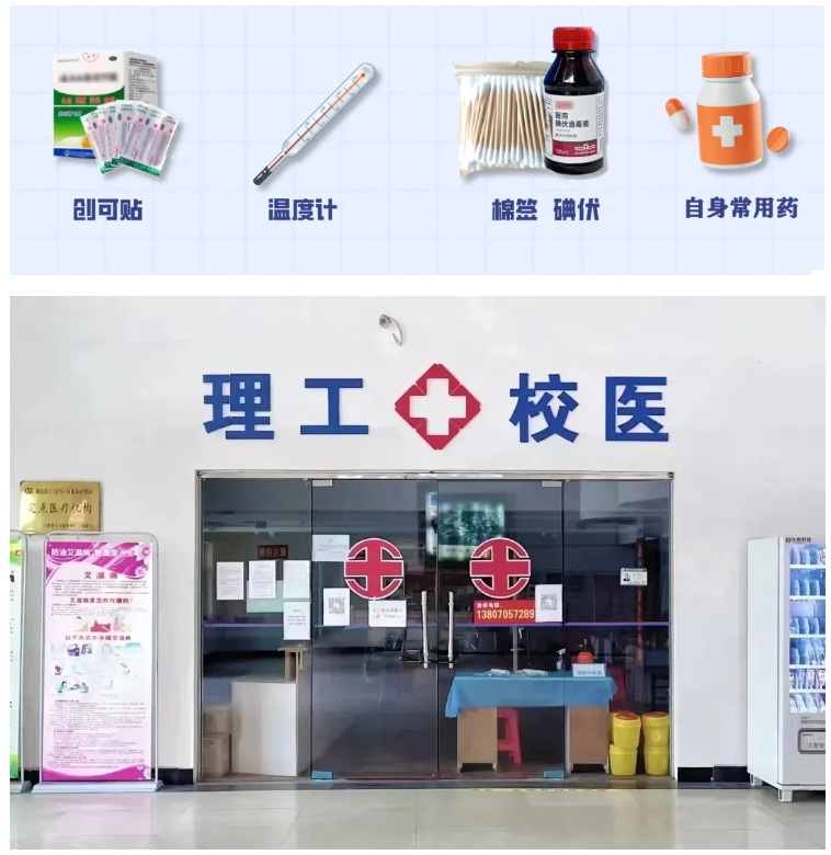 学校医务室位于医学院二楼大厅,设施完善,医师人员充沛,学生使用方便。如有身体不适或遇到突发状况的同学可前往校医室就诊(学校就诊卡报销八折,开学后班级会统一发放)。