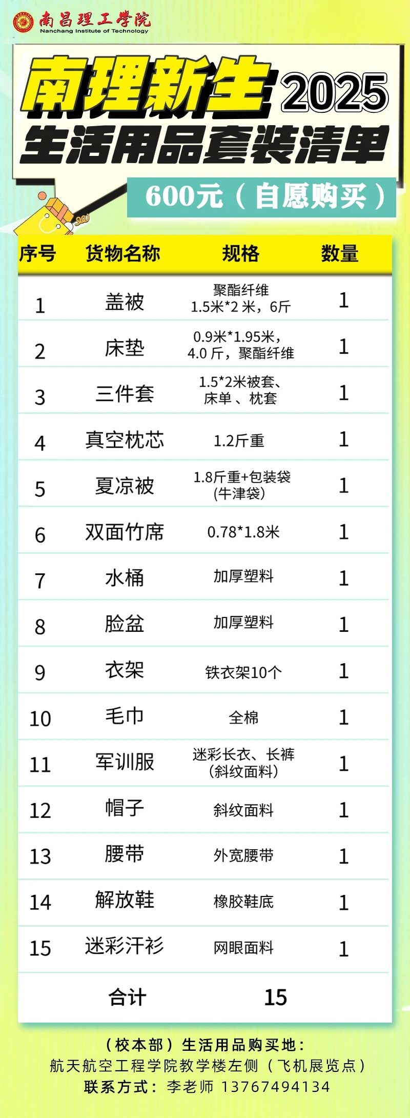 床上用品和军训服装可从学校自费购买,避免路途携带不便!