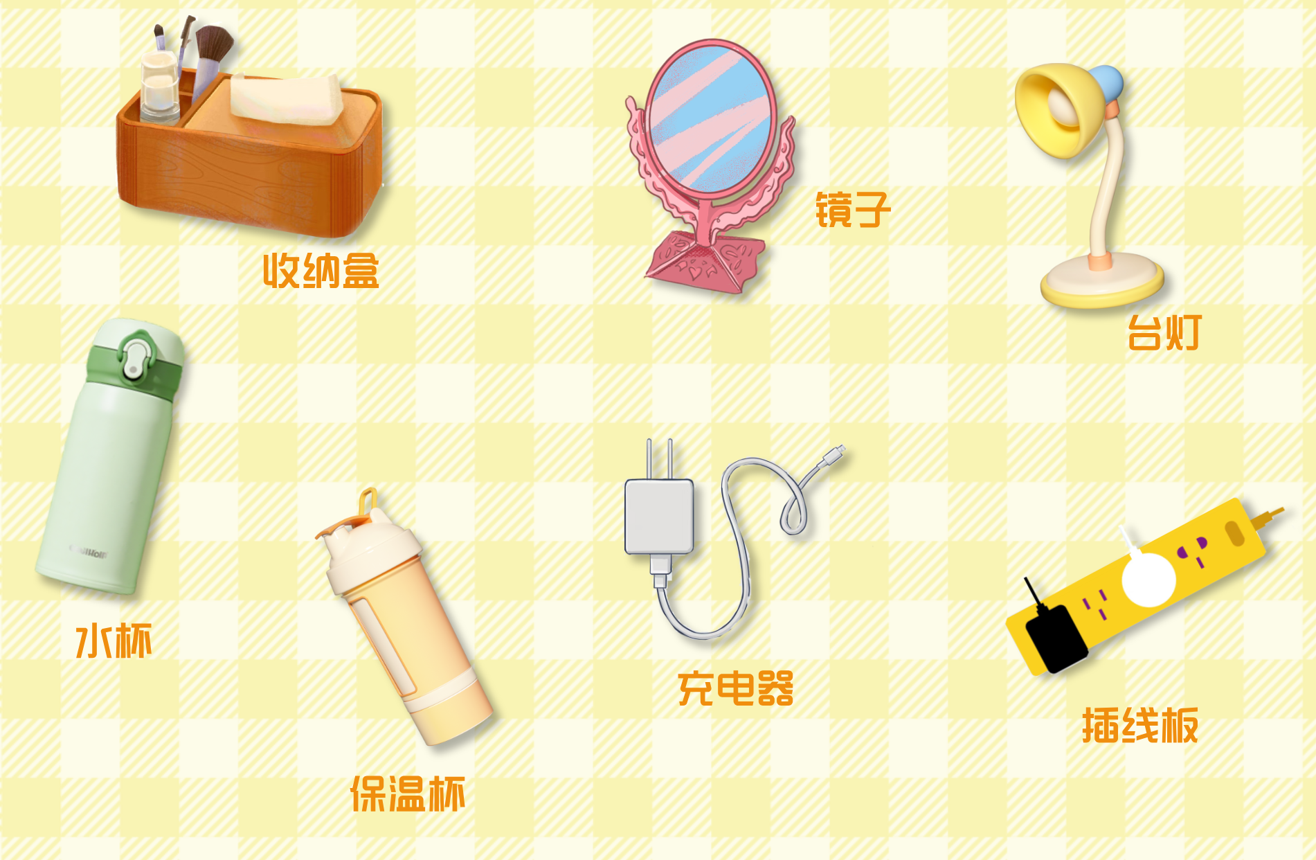 7.宿舍日常:台灯、墙纸、保温水壶、水杯、雨伞、剪刀、水果刀、胶水、日历、针线包、小风扇、多排插座、饭盒&餐具、洗洁精&洗碗毛巾、抹布、花露水、清扫寝室的工具、镜子